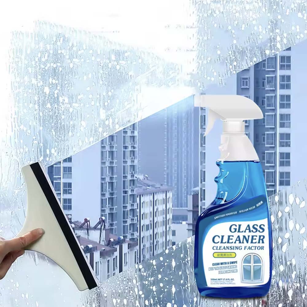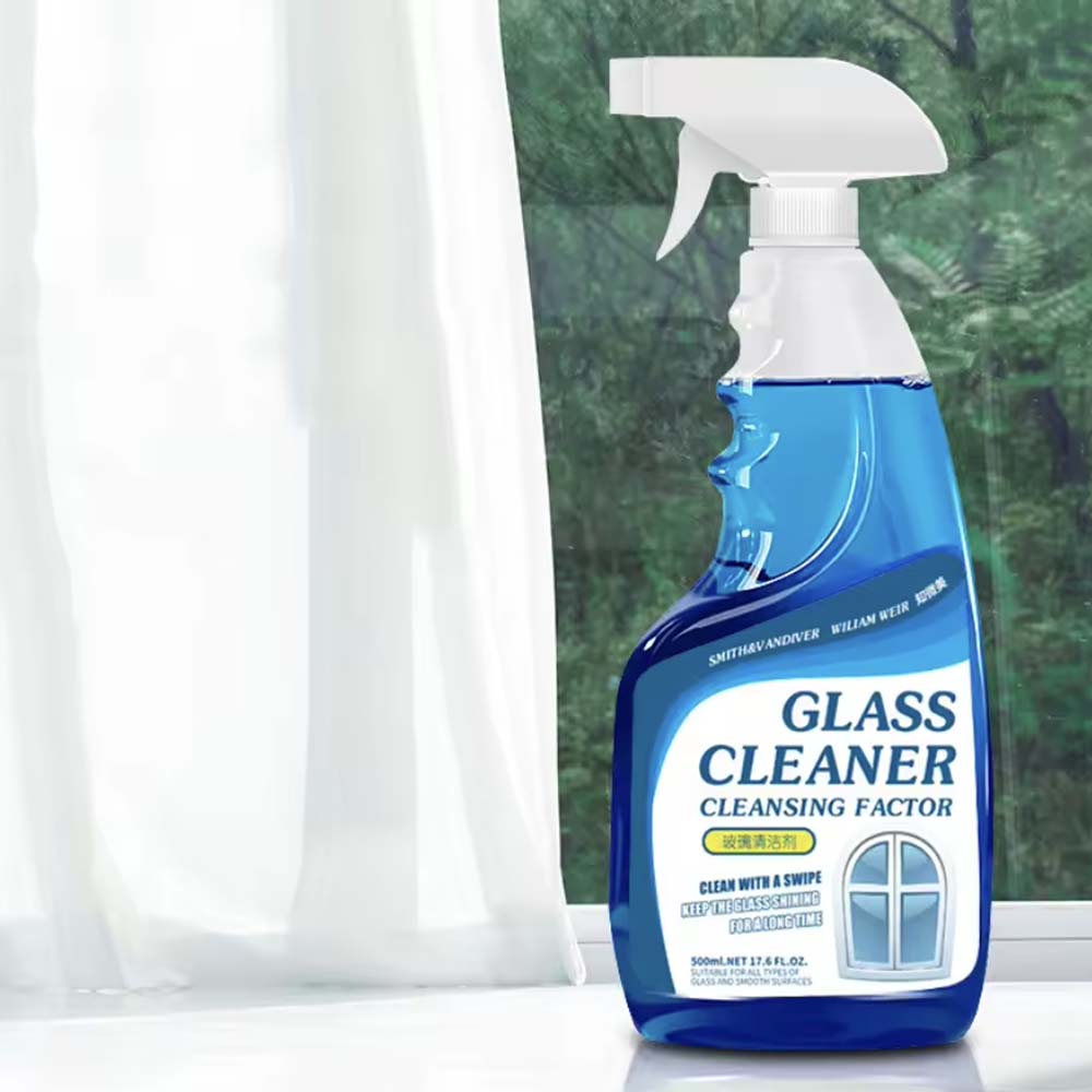 Household glass cleaner spray: 500ml blue liquid, ≥80% active ingredients, eco-friendly plant-based formula.