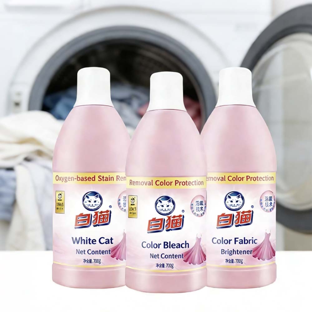 Whitecat oxygen bleach liquid: 1000g bottle, 5%-15% active ingredients, low foam & easy to rinse.