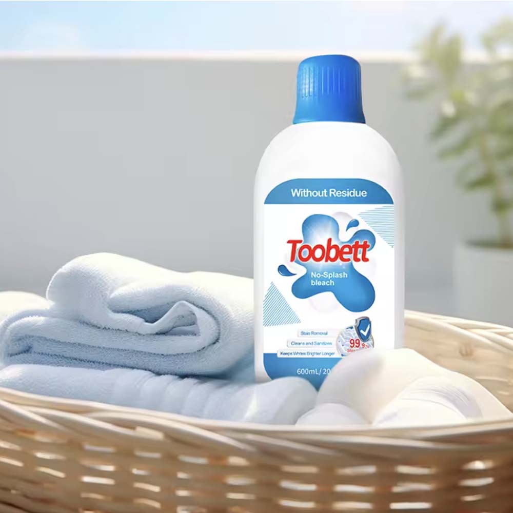 Laundry bleach liquid: 600ml capacity, 0%-5% active ingredients, 3-year shelf life, no-splash design.