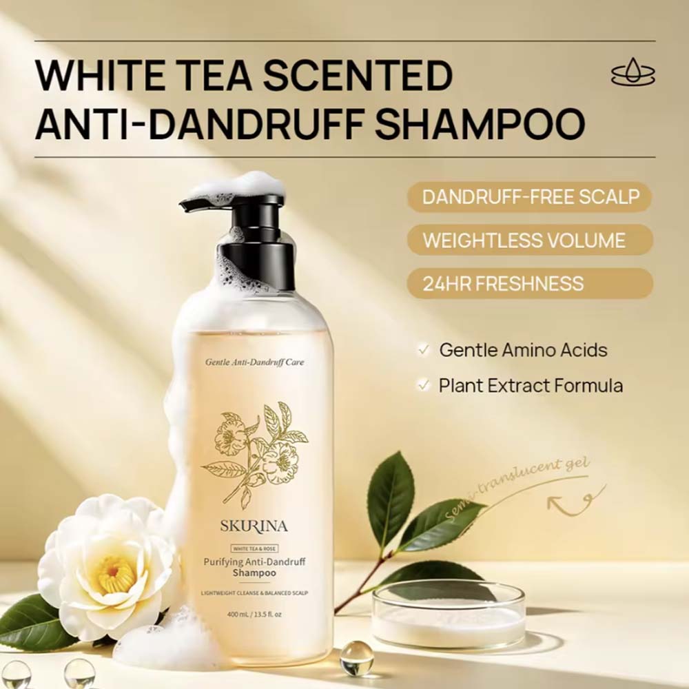 White tea anti-dandruff shampoo: 400ml vegan formula, contains hydrolyzed collagen and plant extracts, for adult all hair types.