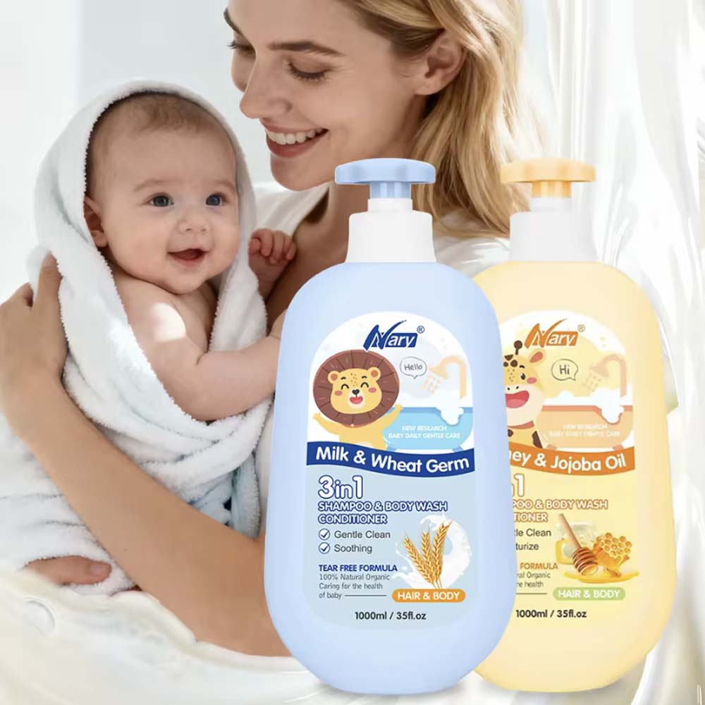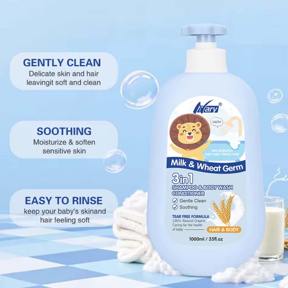 Kids 3-in-1 care product: 1000ml cream form, milk/wheat germ & honey/jojoba oil scents, unisex for babies.