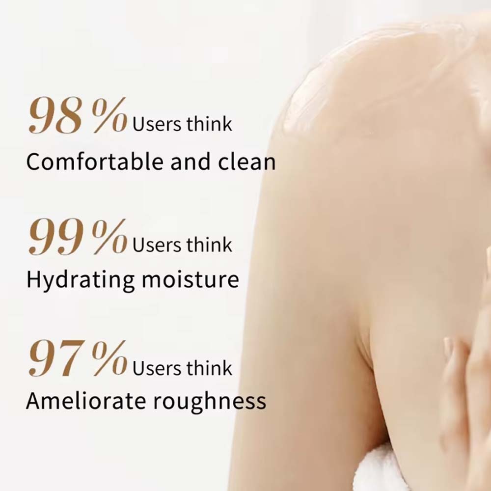 User feedback: 98% feel clean, 99% experience hydration, 97% notice improved rough skin after use.