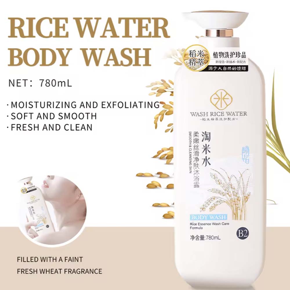 Rice water shower gel: 780ml bottle, 3-year shelf life, for adult females, suitable for all skin types.