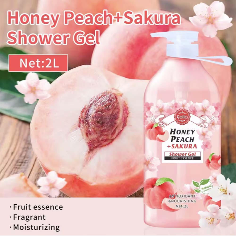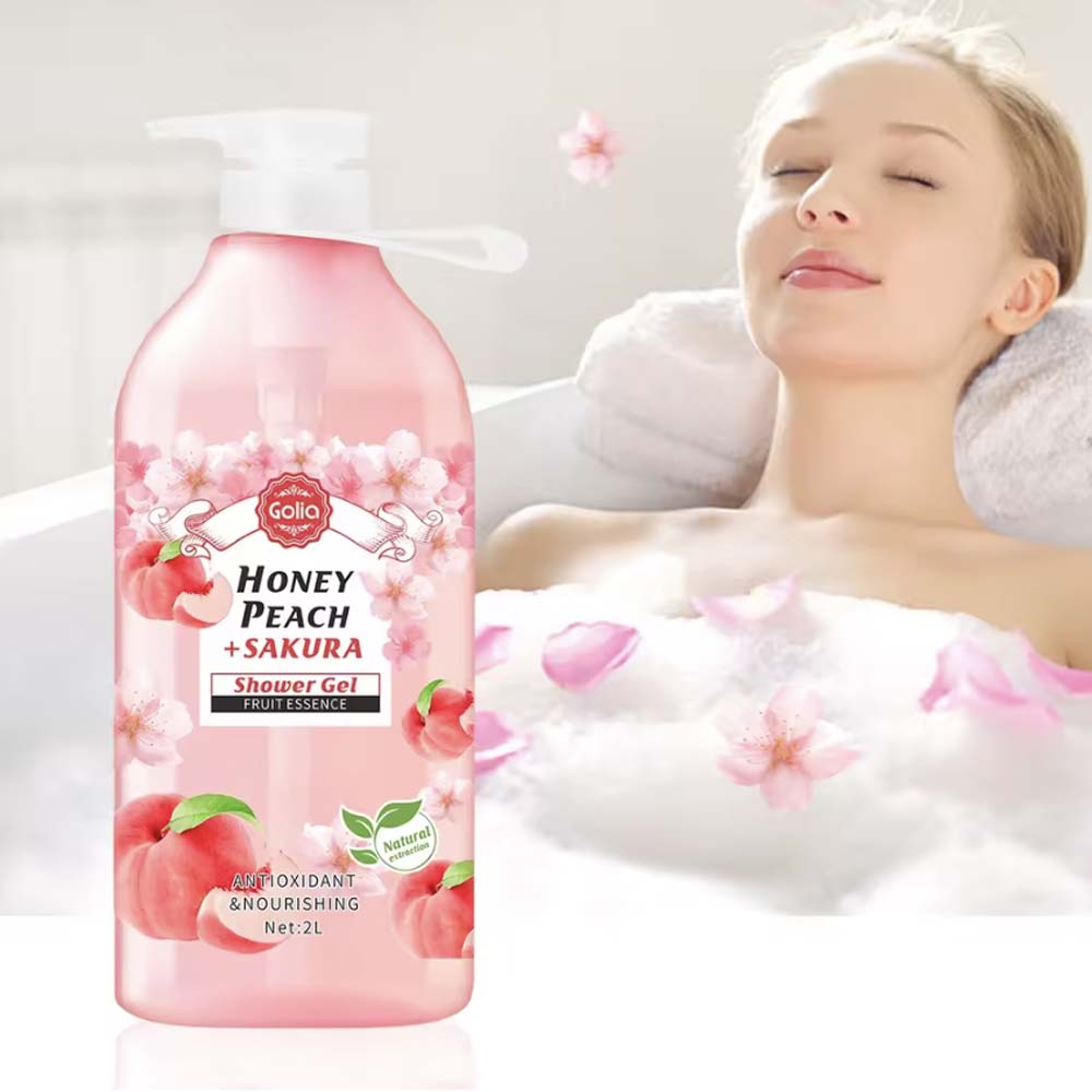 Peach cherry blossom shower gel: 2.08L gel form, Gaolaiya brand, herbal formula with fruit essence, unisex for adults all skin types.