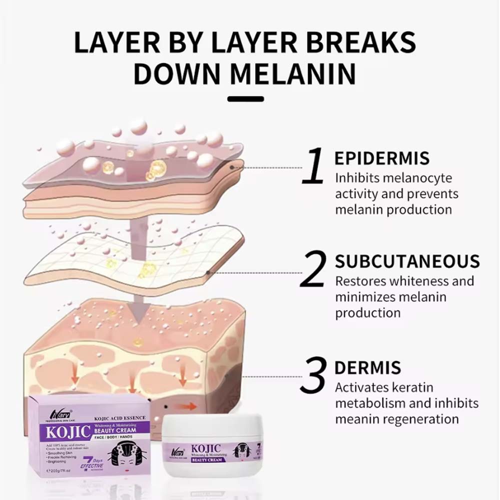 100% kojic acid essence added, inhibits melanocyte activity, activates keratin metabolism, strengthens skin barrier.