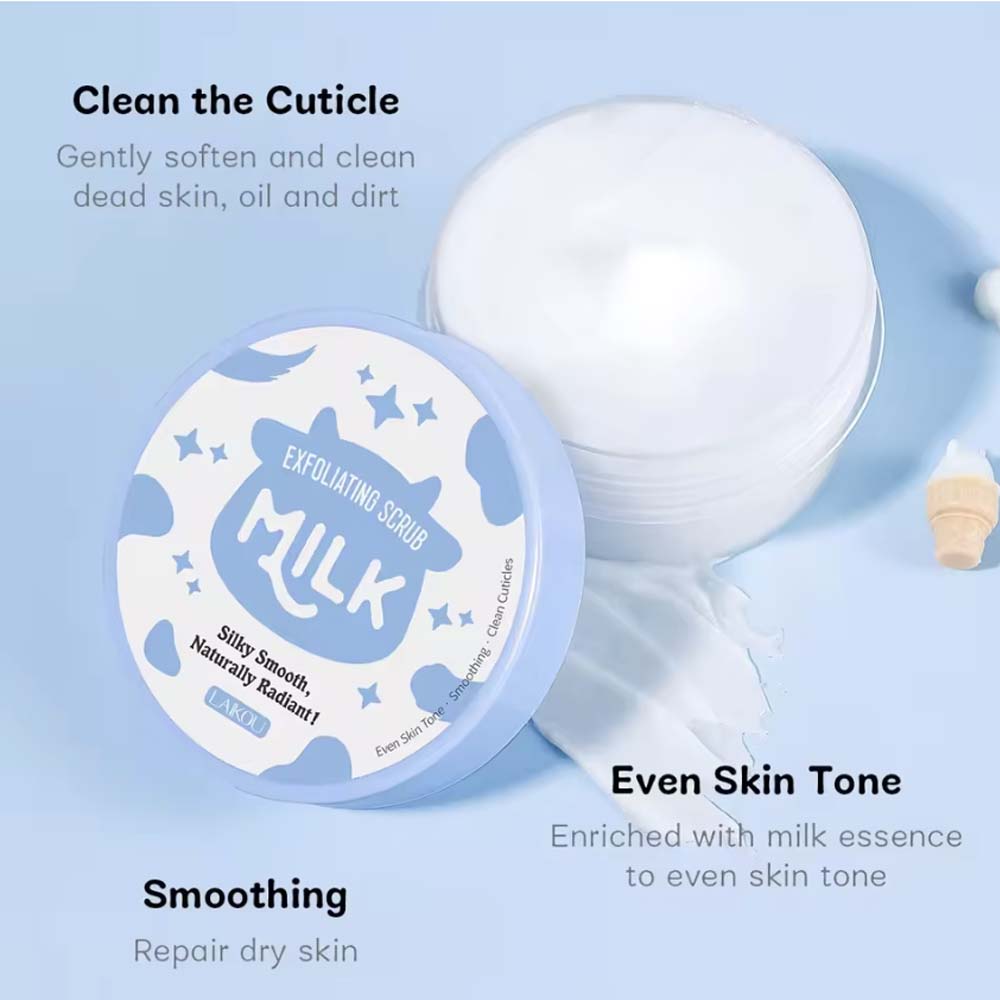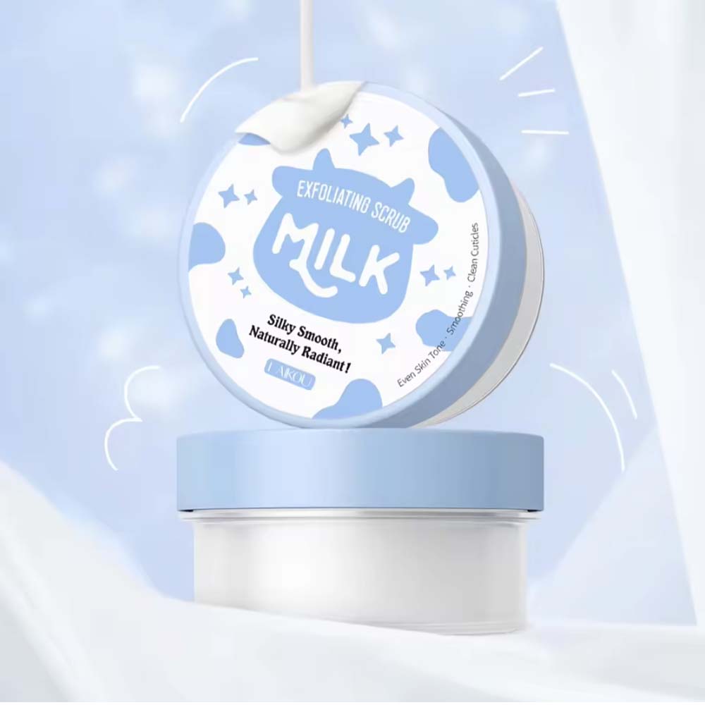 Milk exfoliating body scrub: 90g scrub form, Private label, Australian milk extract+niacinamide+alpha-arbutin formula.