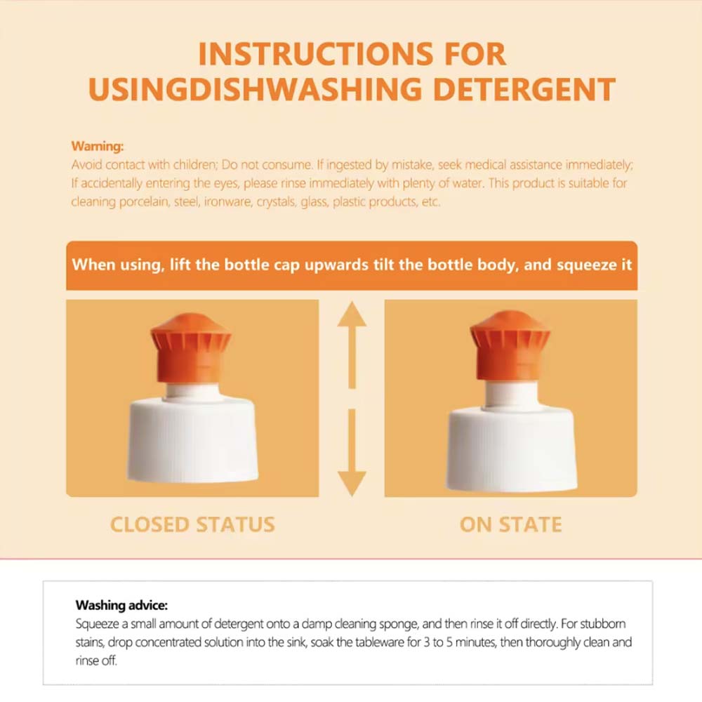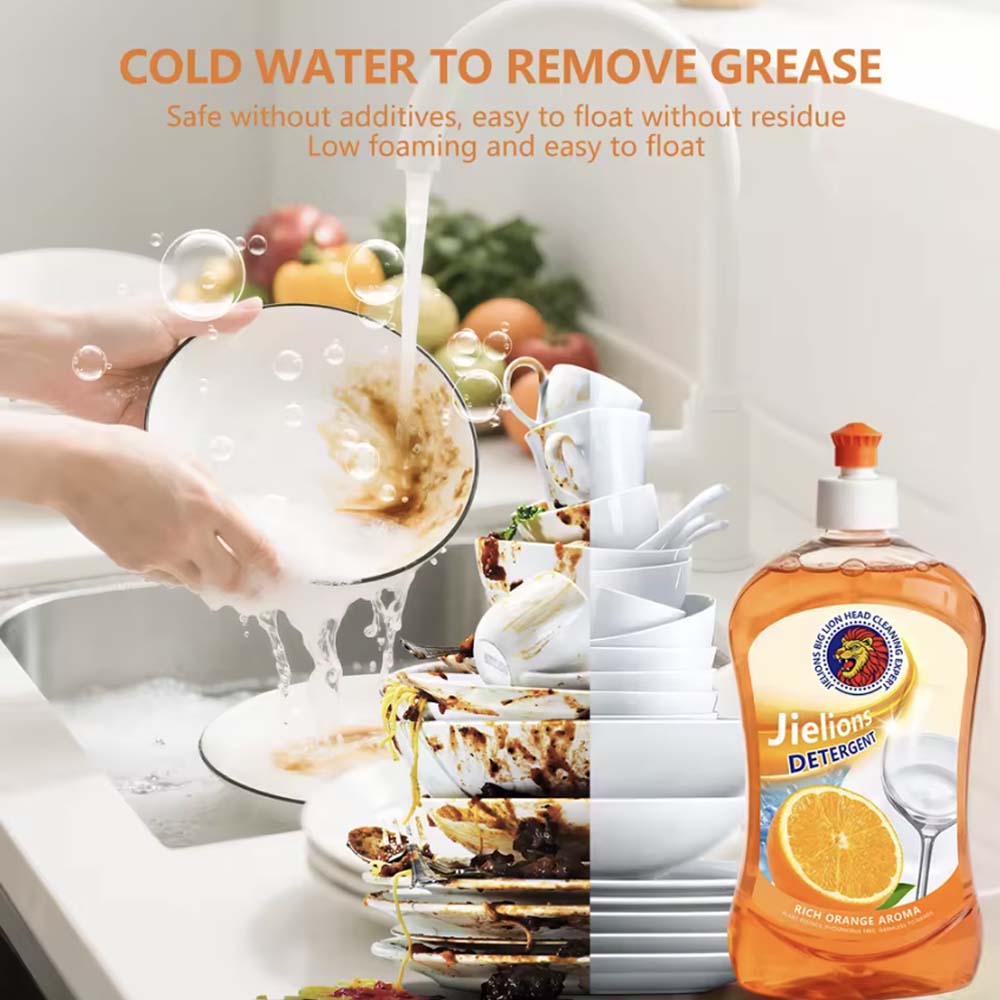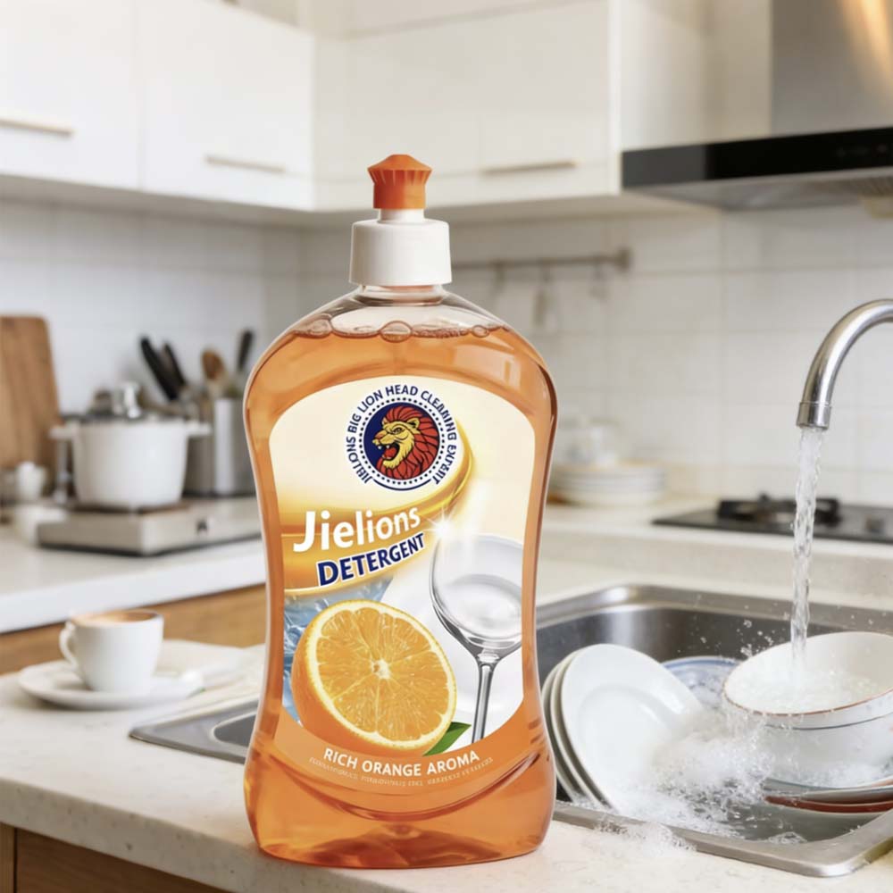 Kitchen dish soap: Jielions brand, concentrated sweet orange extract, 5%-15% active ingredients, eco-friendly spray type.
