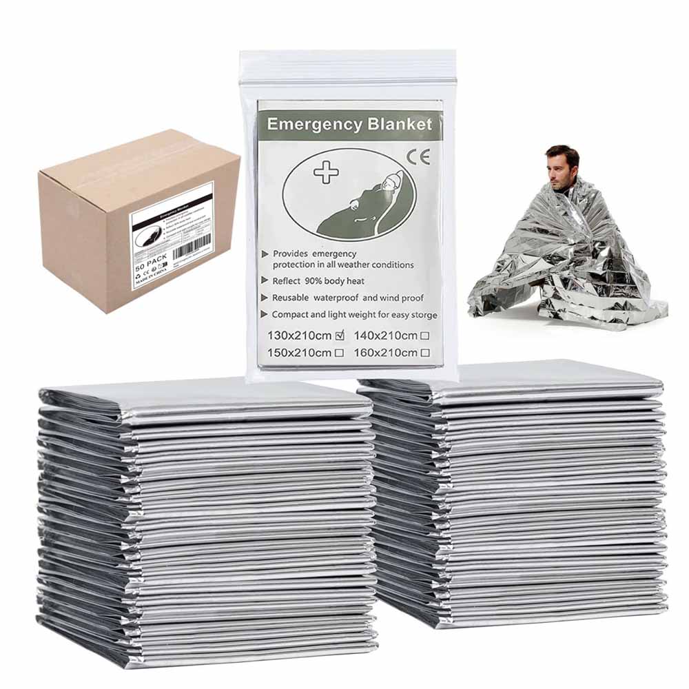 50 packs mylar blankets: Individually packaged, suitable for all ages, ideal for outdoor activities and emergencies.