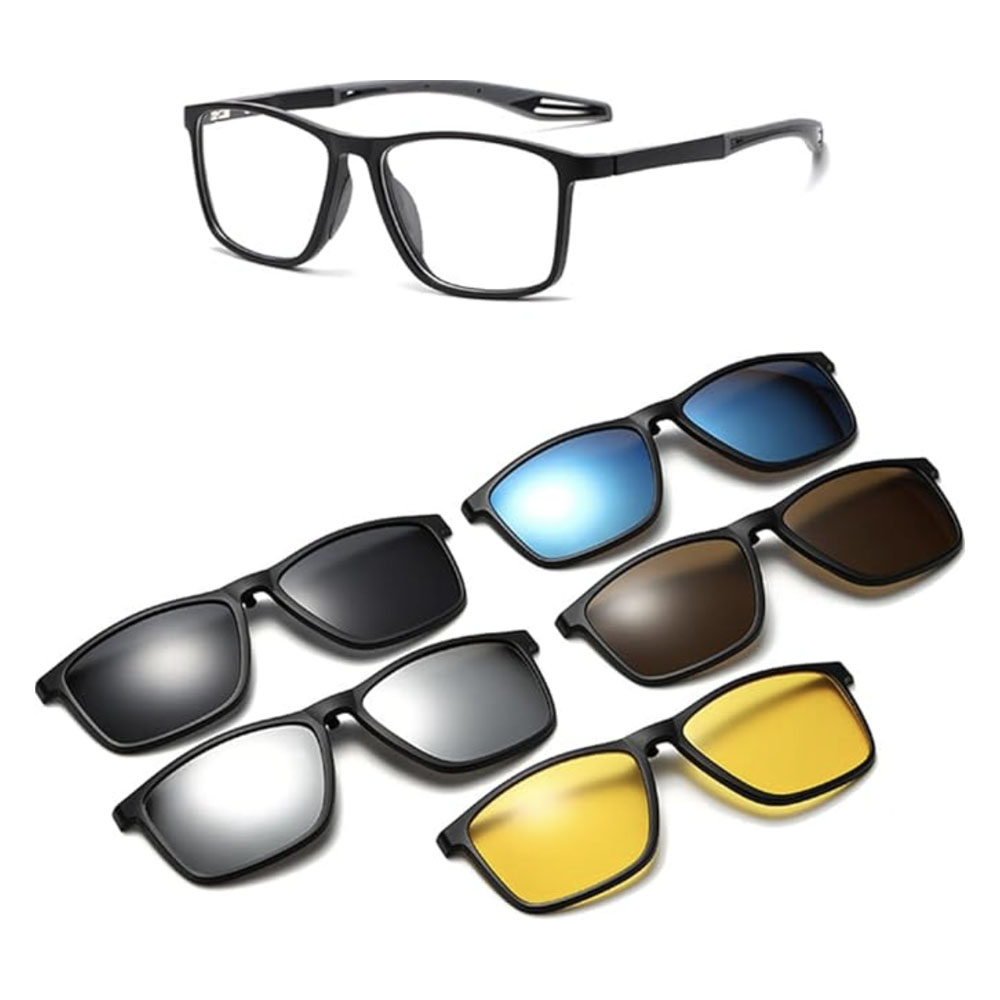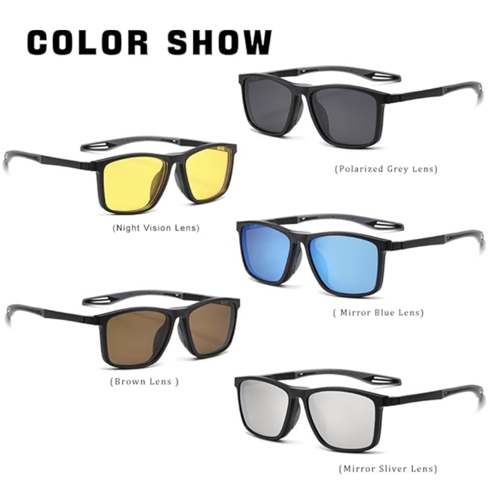 1 frame + 5 functional lenses: Polarized black-gray for driving, yellow for night vision, blue/silver/brown for daily fashion wear.