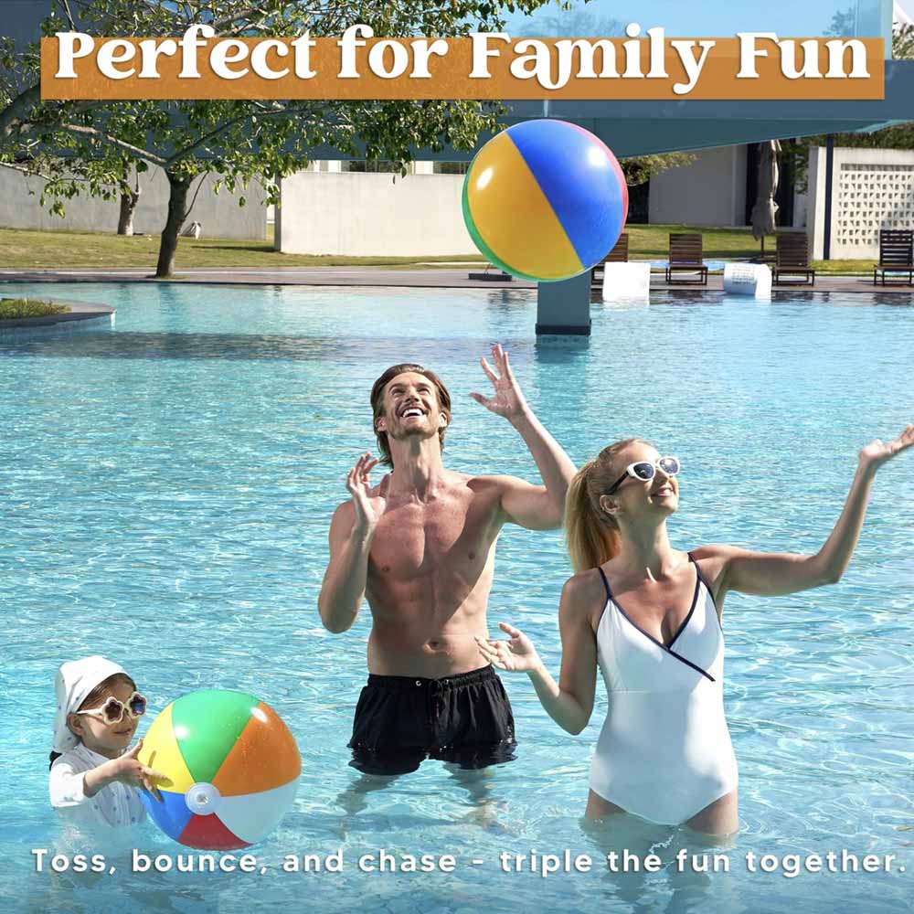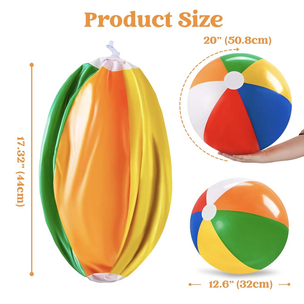 4 packs inflatable beach balls: 20" deflated size, suitable for kids over 36 months, ideal for outdoor play.