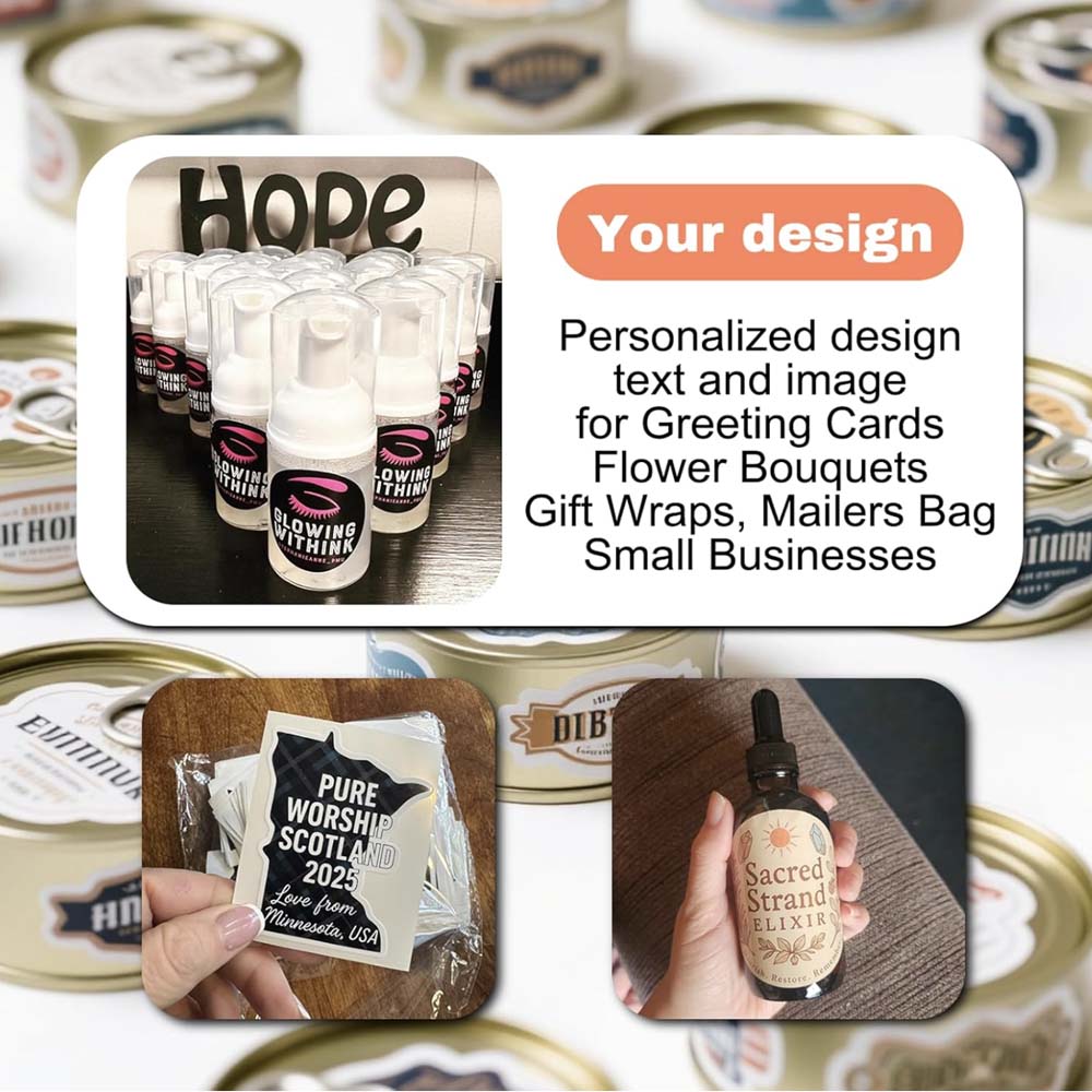 Versatile Applications: Ideal for business logos, water bottle labels, apparel/holiday/wedding/gift stickers, box labels.