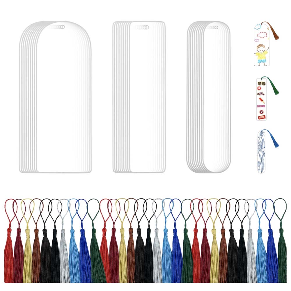 Complete 30PCS Kit: 30 blank acrylic bookmarks (3 shapes: rectangle/semicircle/oval) + 30 colorful tassels.