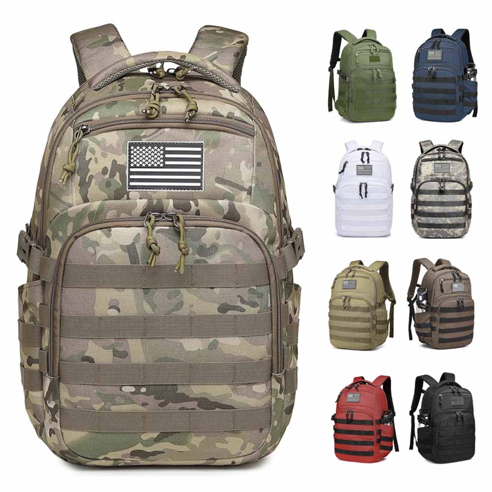 MOLLE system design: Full webbing for attaching tactical bags or equipment.